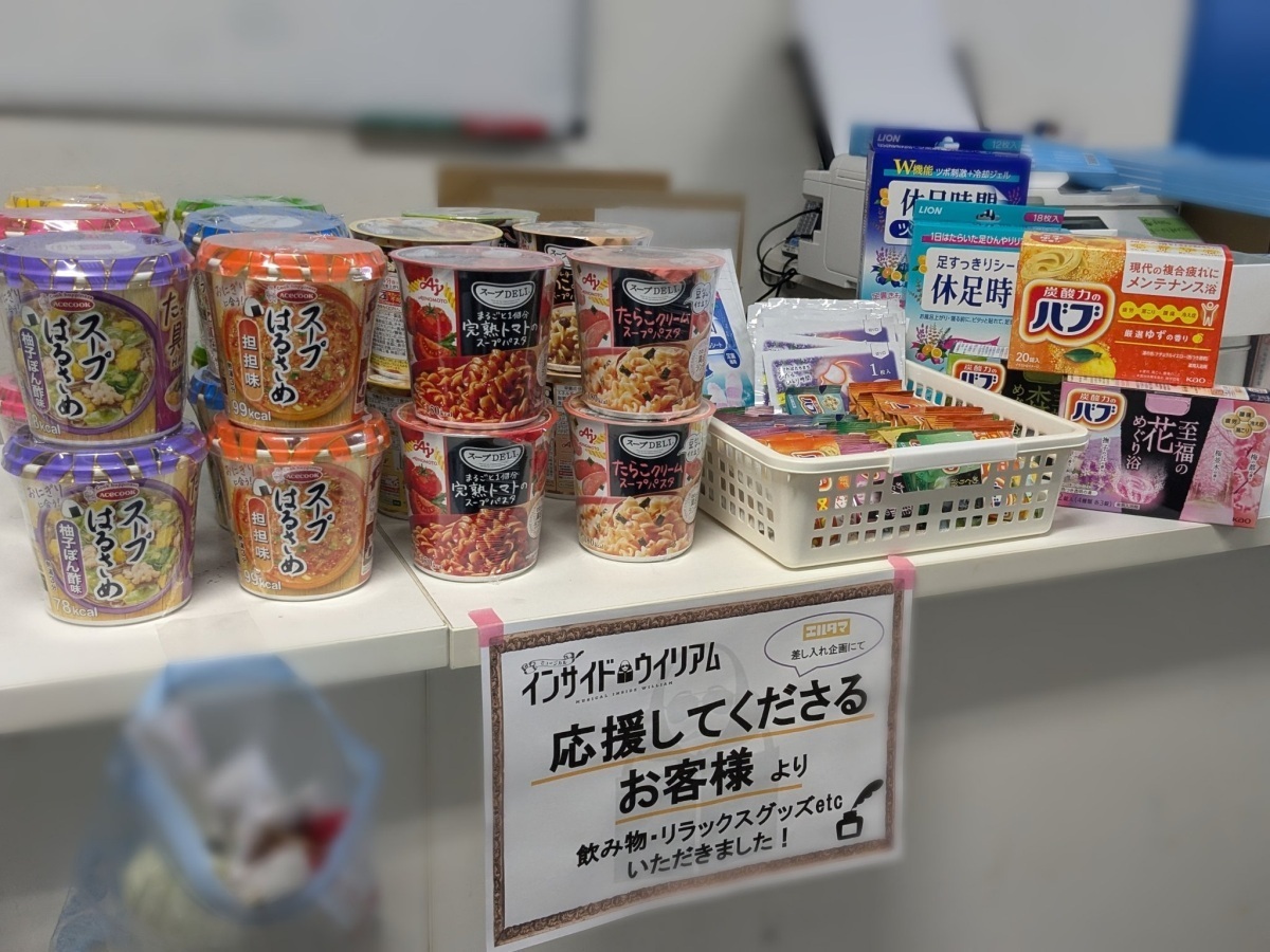 先日実施されたミュージカル「インサイド・ウィリアム」応援差し入れ企画にて、ファンの方々の応援の気持ちがこめられた差し入れが贈られました。また、ご登録いただいた全てのメッセージも届けられました。
