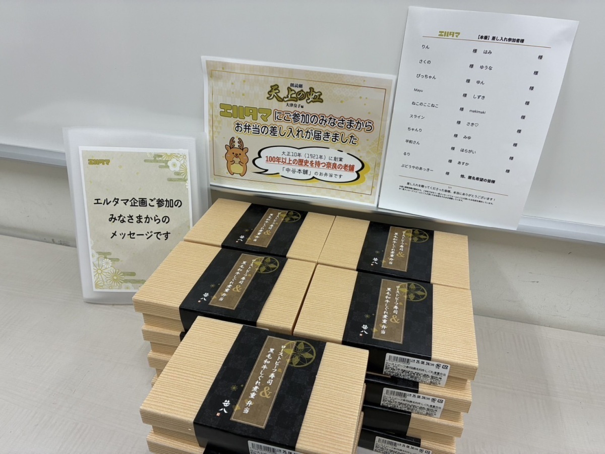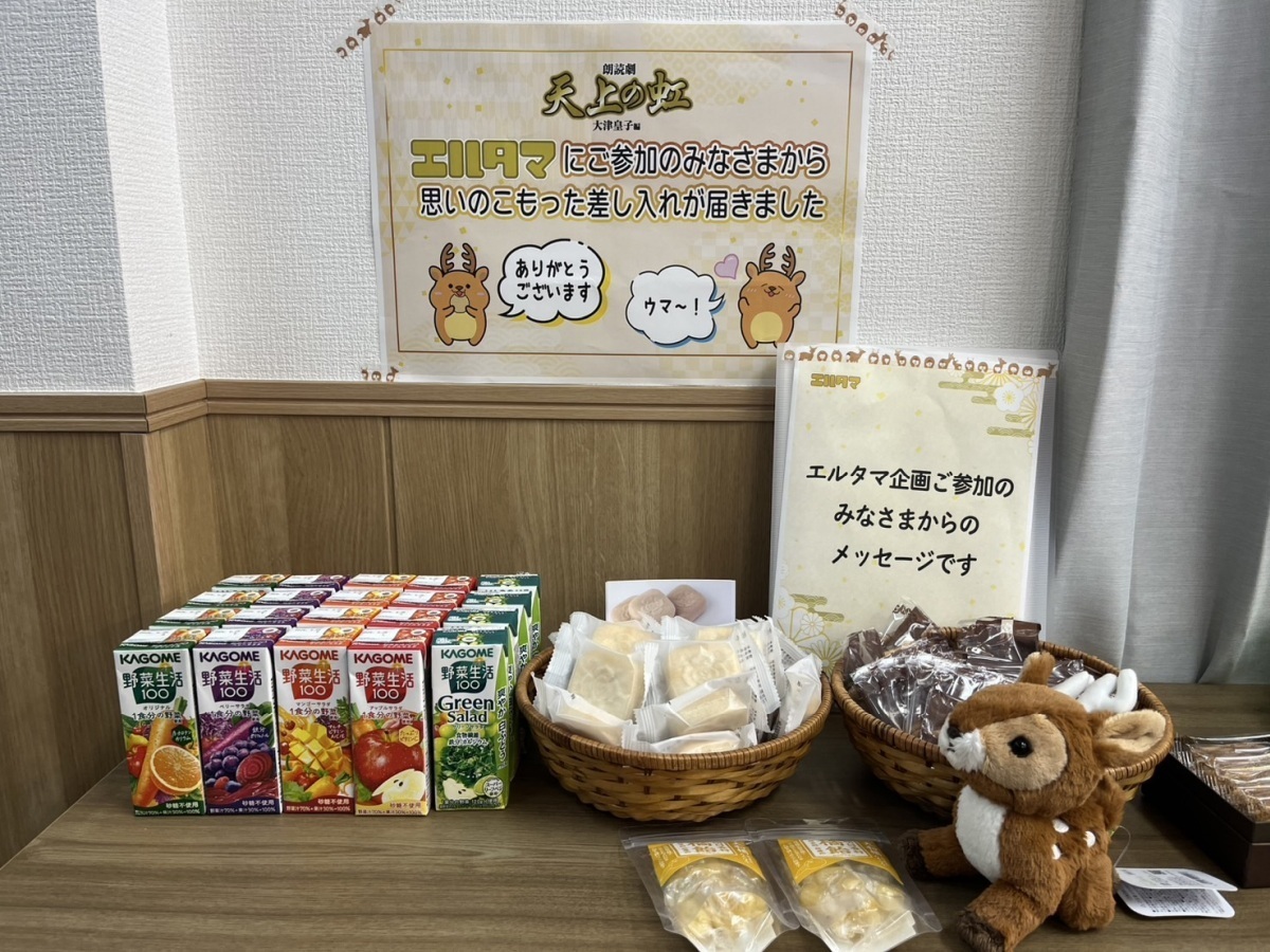 先日実施された朗読劇「天上の虹」大津皇子 編 差し入れ企画にて、ファンの方々の応援の気持ちがこめられた差し入れが贈られました。また、ご登録いただいた全てのメッセージも届けられました。