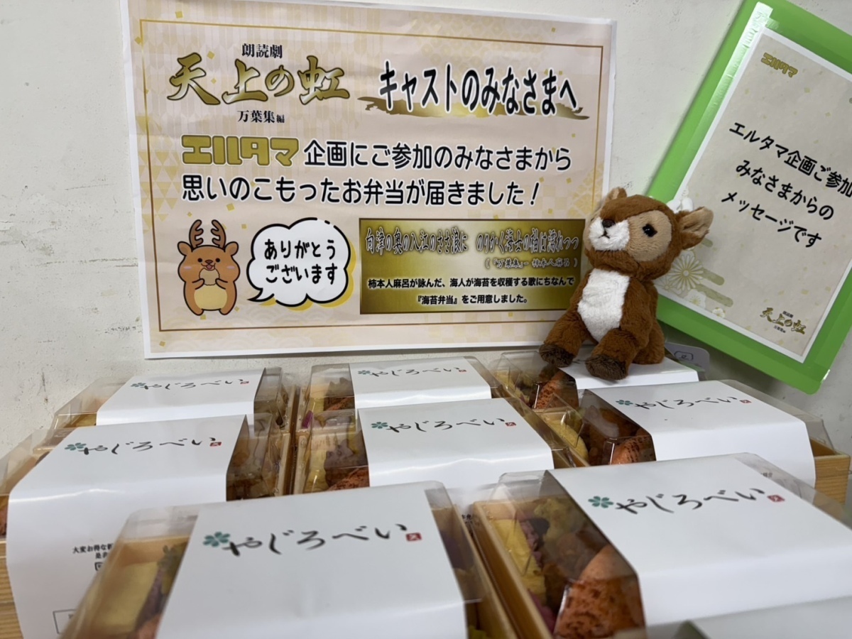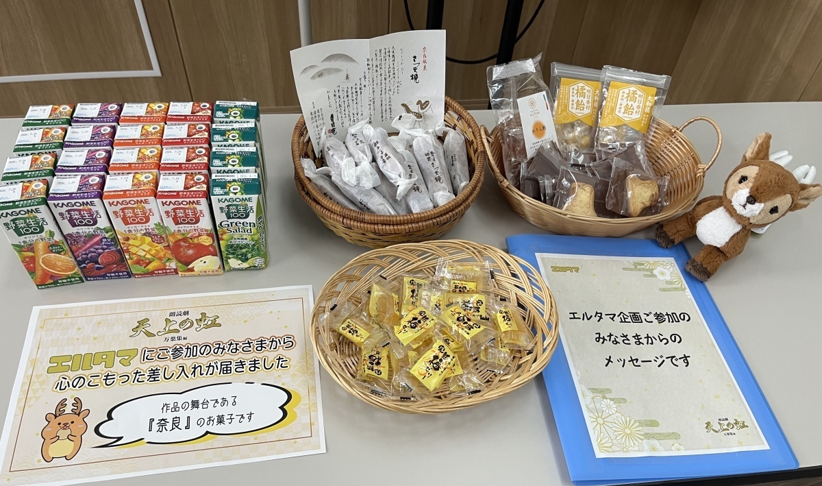 先日実施された朗読劇「天上の虹」万葉集 編 差し入れ企画にて、ファンの方々の応援の気持ちがこめられた差し入れが贈られました。また、ご登録いただいた全てのメッセージも届けられました。